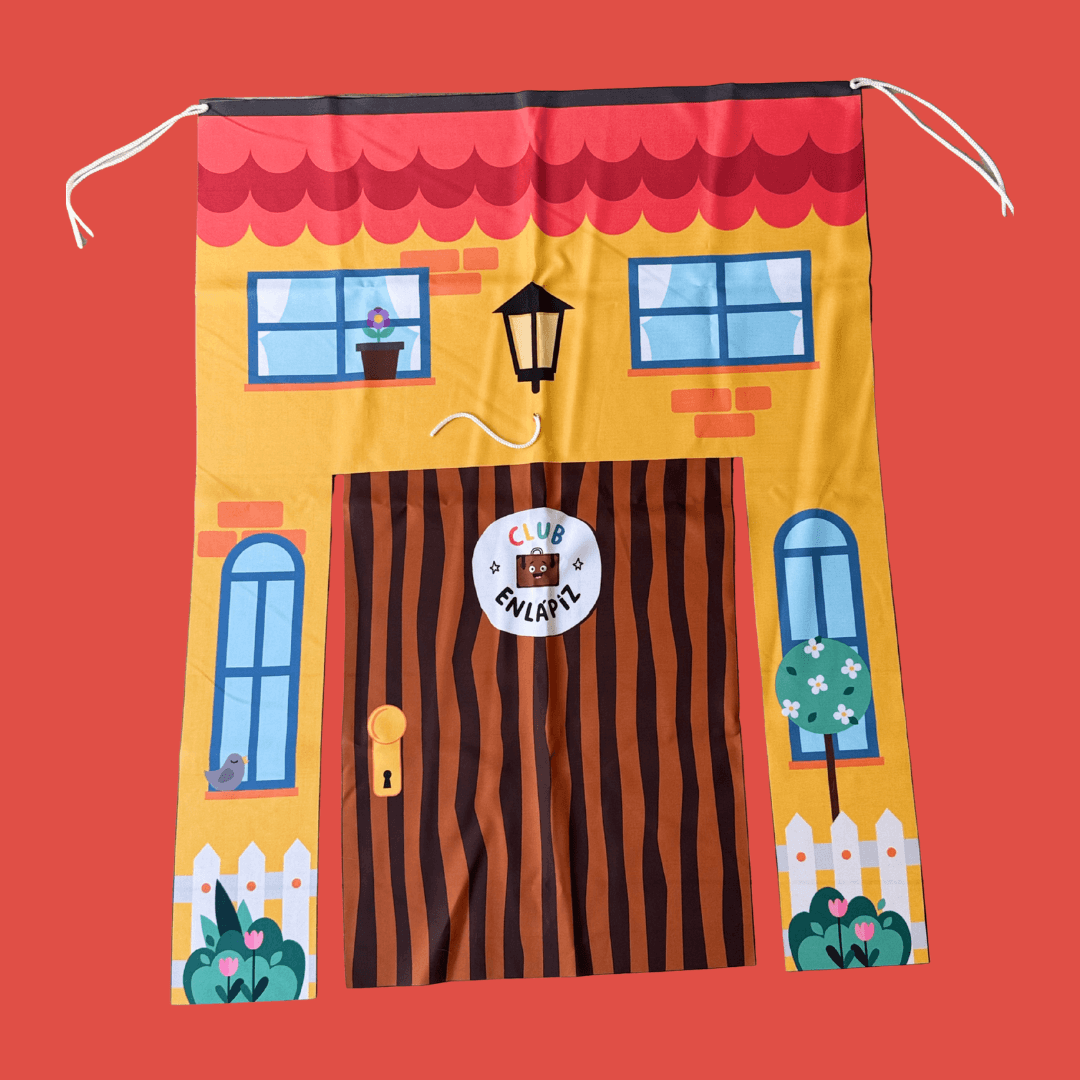 Casita de tela para jugar, con estampa colorida y lazos para atar de 2 sillas y levantar la puerta.