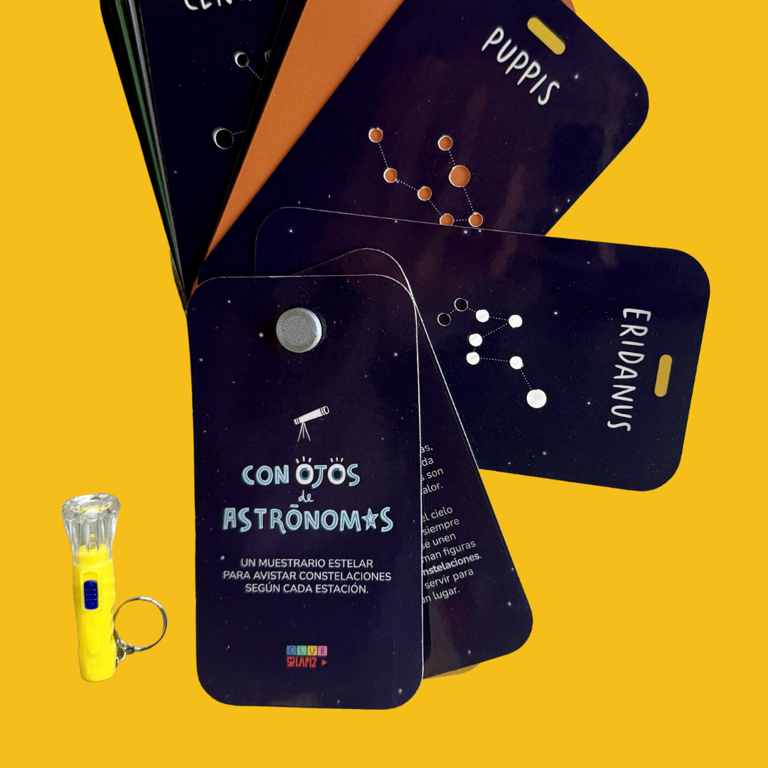 Con ojos de astrónomo: Muestrario Estelar, de Club EnLápiz. Un muestrario estelar para avistar constelaciones según cada estación. Jugá y aprendé descubriendo curiosidades y constelaciones! Incluye el muestrario y una linterna.